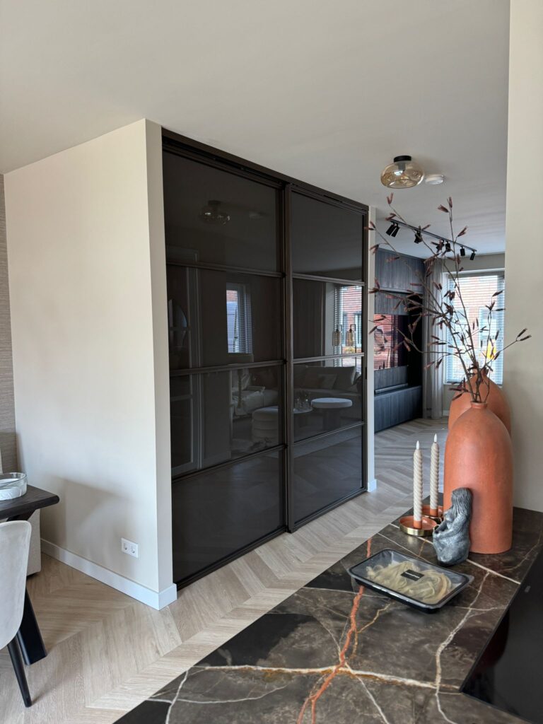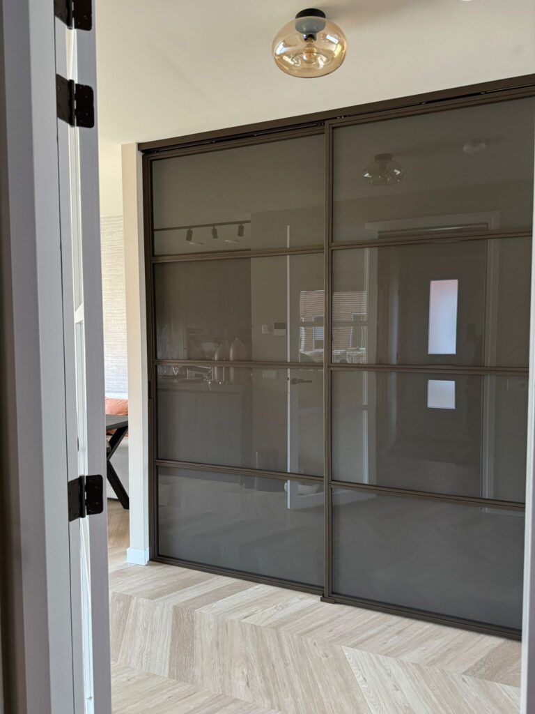 Onder de trap heeft de klant een handige kapstokruimte gecreëerd. Dankzij onze schuifdeuren blijft deze ruimte netjes uit het zicht, terwijl deze toch gemakkelijk toegankelijk blijft. Het brons matte veiligheidsglas zorgt ervoor dat er niet doorheen gekeken kan worden, wat extra privacy biedt zonder het interieur te verzwaren.